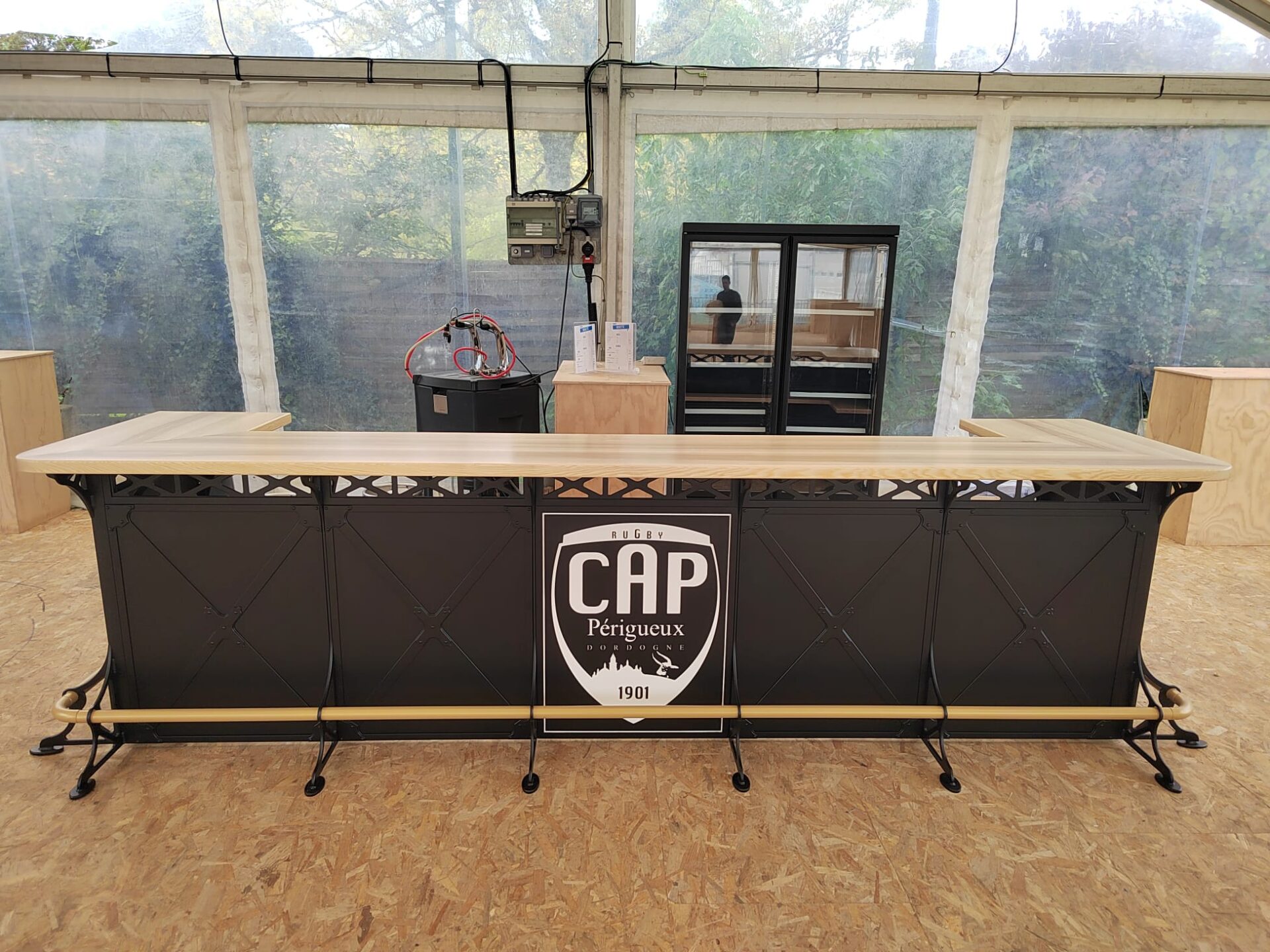Nous sommes heureux de vous présenter notre dernière réalisation : un bar sur mesure qui habille désormais l’espace partenaires/VIP du Club Athlétique Périgueux Dordogne Officiel. Conçu et fabriqué dans nos ateliers, ce bar reflète les ambitions et l’élégance du club, offrant un cadre accueillant et raffiné à ses partenaires.